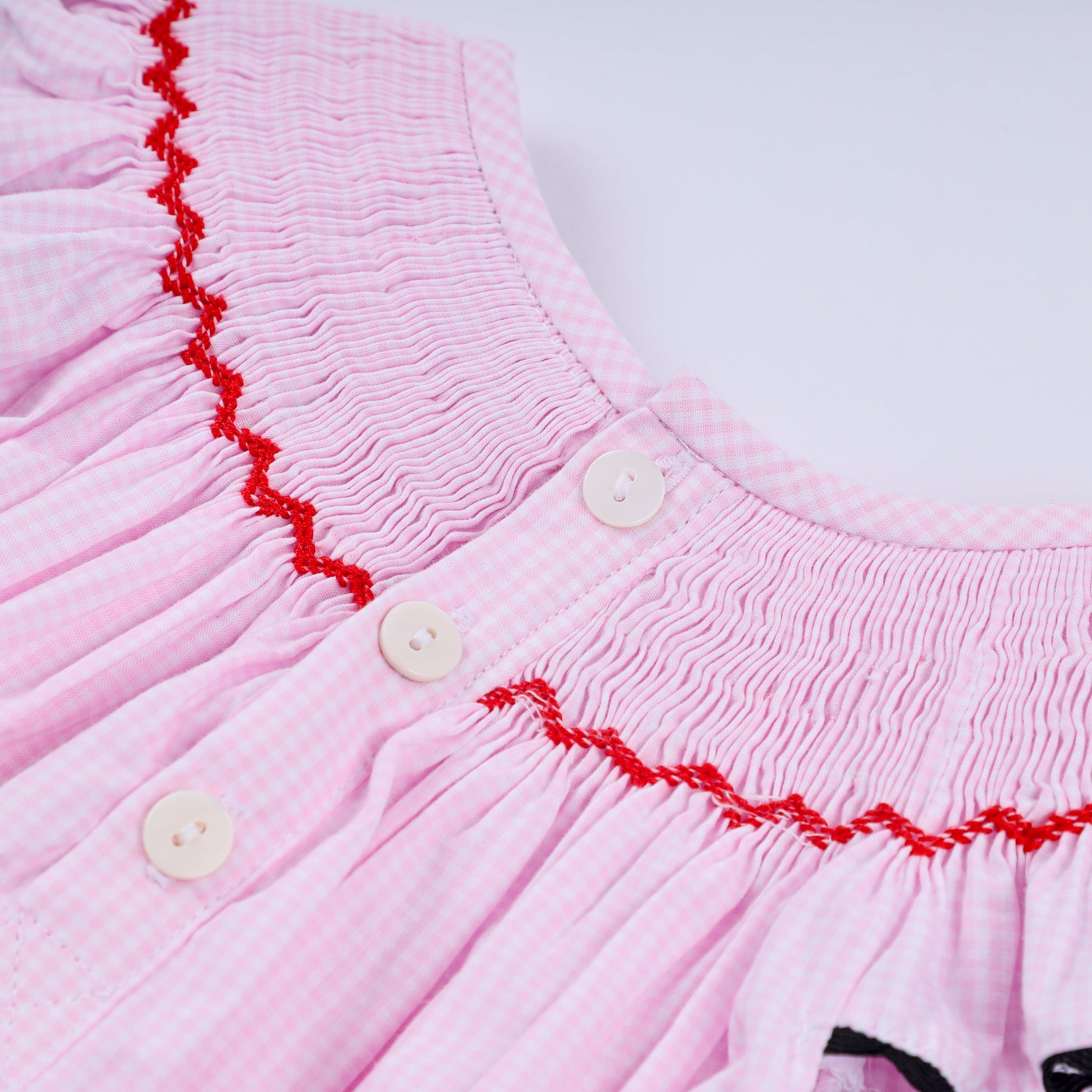 Meet the dress that's as fun as playtime itself! This charming bubble features a classic red plaid pattern with delightful hand-smocked detailing that adds texture and visual interest. The character design brings personality to every wear, while ruffled accents frame the neckline and sleeves for an extra touch of whimsy. Perfect for little ones who love standing out, this playful piece combines timeless smocking craftsmanship with modern character appeal. Comfortable, cheerful, and undeniably adorable—it's the kind of dress that makes getting dressed an adventure.