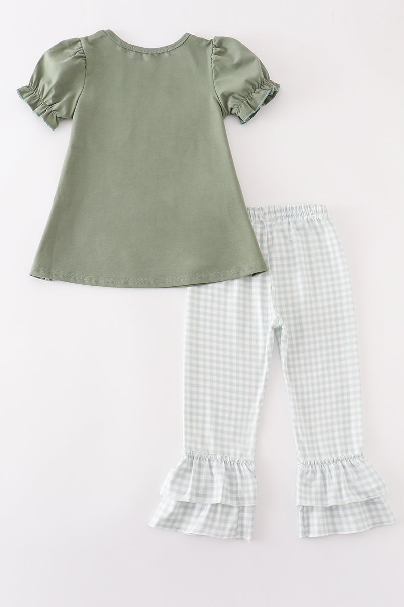Choo-choo off to cuteness with this Green Train Pumpkin Applique Girl Set! Featuring a charming pumpkin applique and a playful green train design, this set is perfect for your little one. With its soft and comfortable fabric, your child will be ready to conquer the day in style. All aboard the fashion train!